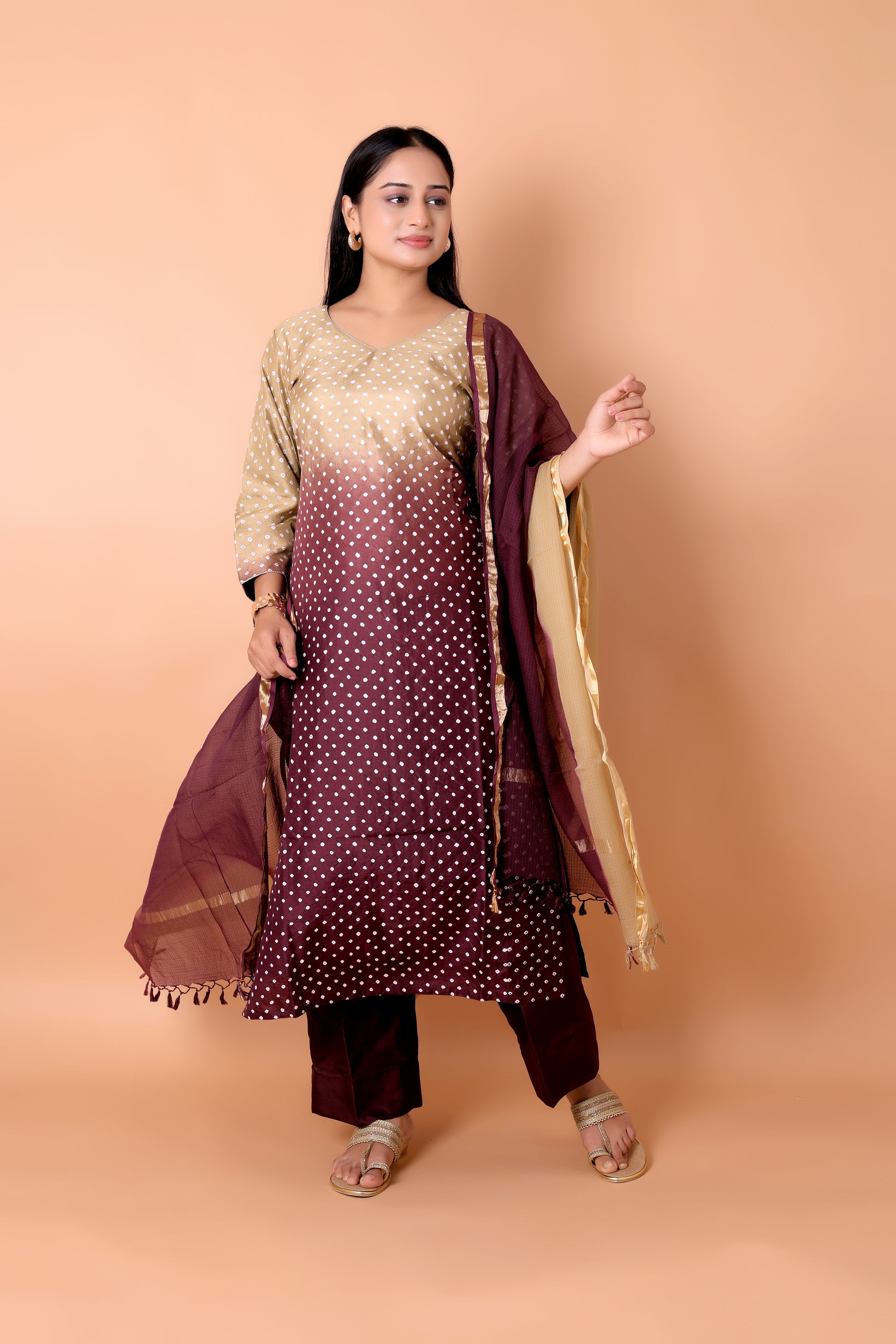 The Bandhani Ombre Hand Tie-Dye Suit Set with Kotta Silk Dupatta is a stunning fusion of heritage craft and timeless elegance. Handcrafted using the traditional Bandhani tie-dye technique, this suit set showcases exquisite ombre shading that reflects true artisanal mastery.