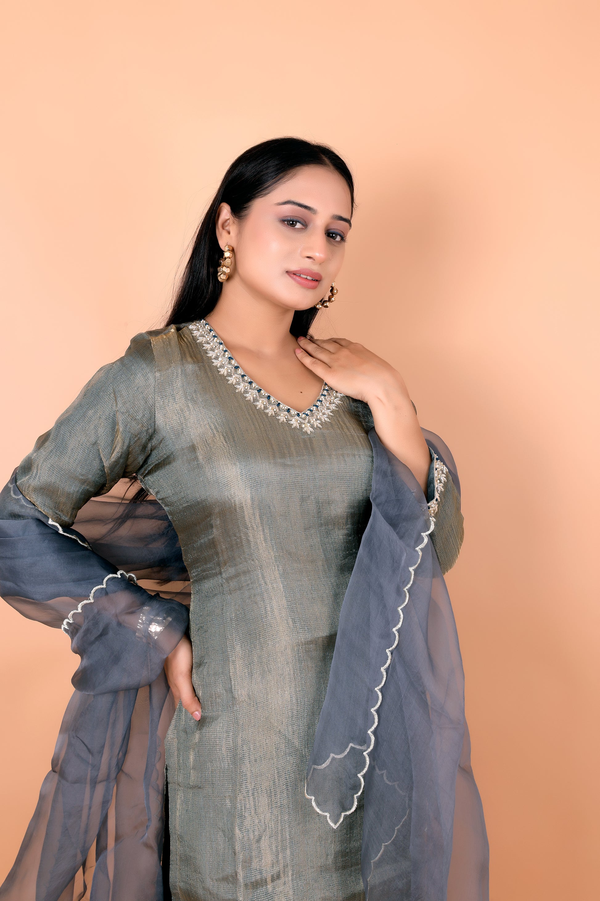 The Grey Crush Tissue Hand Embroidery Suit Set is a perfect blend of luxury and grace. Crafted in premium crush tissue fabric, this ensemble features exquisite hand embroidery that reflects timeless artistry and attention to detail.