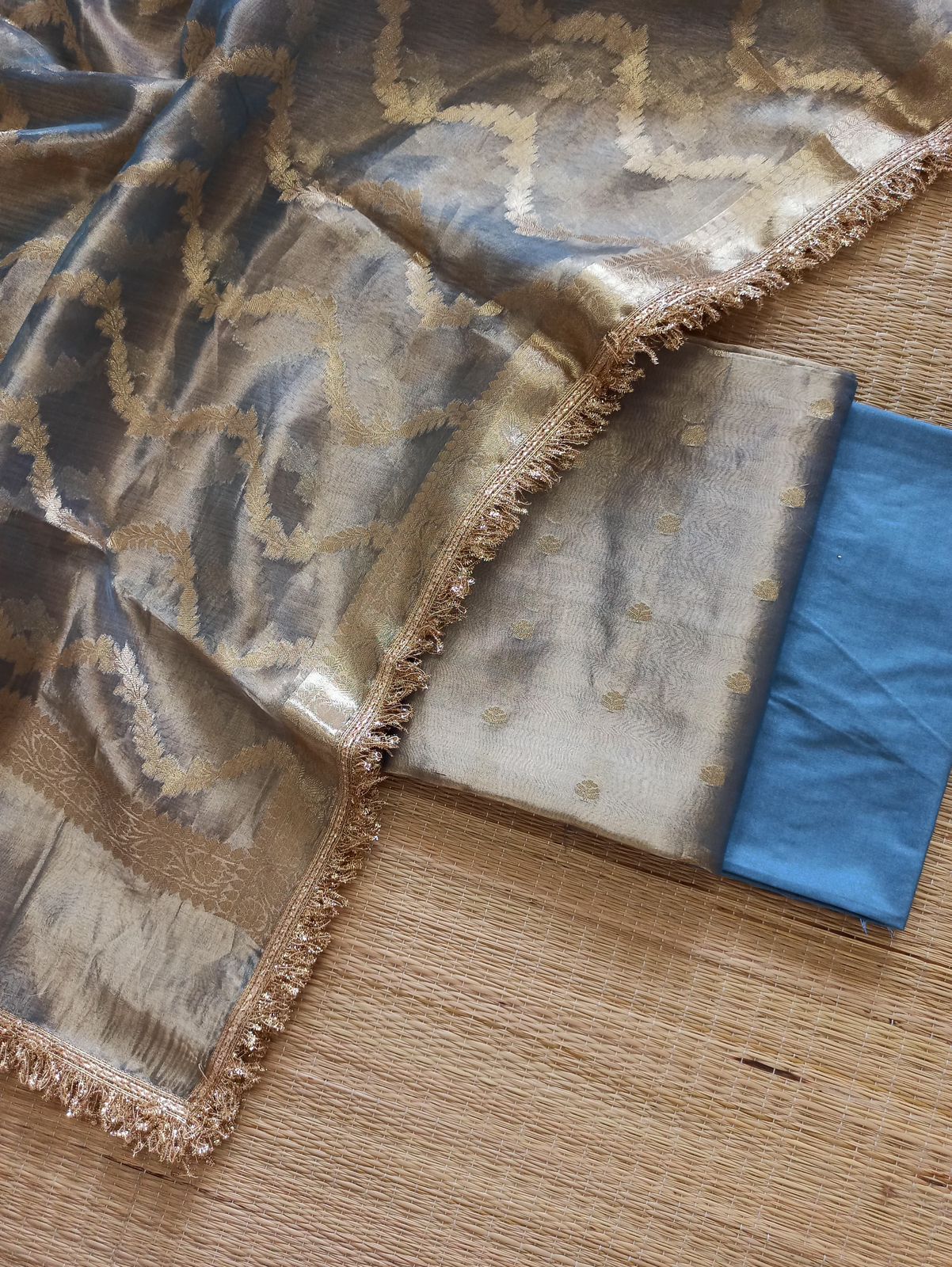 Pure Silk Tissue Reshmi Zari Booti Suit Set with Leheriya Dupatta-Teal Blue